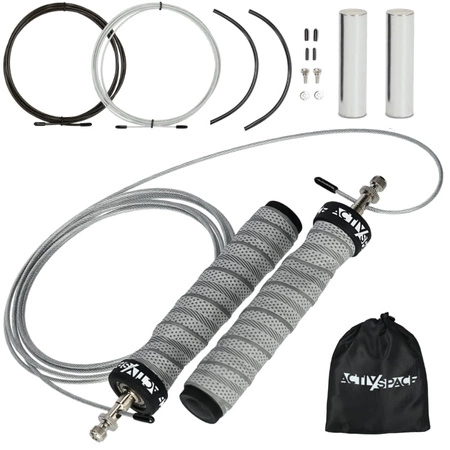 - Specyfikacja:Kolor: szara skakankaMateriał linki: stal, poliuretanMateriał rączki: aluminium, PVCDługość linki: 300 cm (możliwość regulacji)Średnica linki: 3,4 mm i 2,4 mmRączki z łożyskami: ABEC-7 wyposażone w stalową głowicęDługość rączki: 13 cmWaga sk