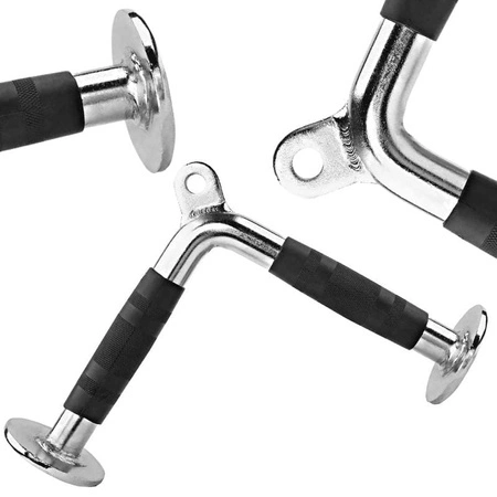 Uchwyt do wyciągu to podwójna rękojeść o trójkątnym kształcie. Wykonana została z wytrzymałej stali oraz gumy zabezpieczającej przed ślizganiem się dłoni. Specjalny otwór pozwala na przymocowanie uchwytu do wyciągu górnego i dolnego, dzięki czemu wytrenujesz różne partie mięśni – bicepsy oraz tricepsy – nie pozostawiając klatki piersiowej czy pleców obojętnymi :)